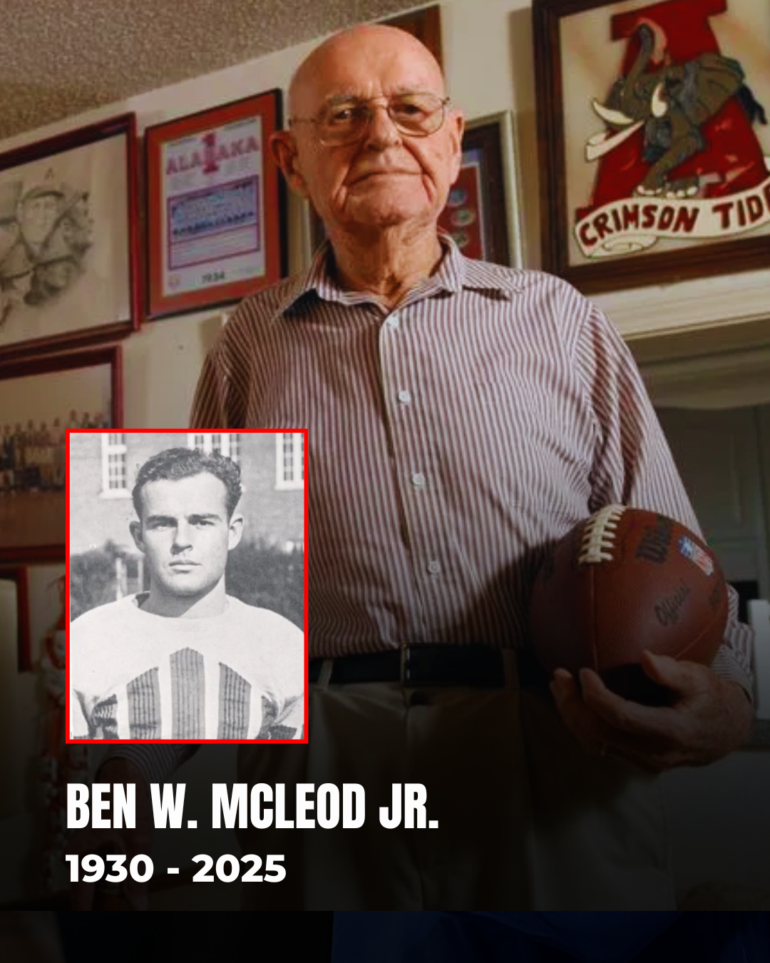 It is with profound sadness that we share the news that Ben W. McLeod Jr., aged 95, a former star of the Alabama Crimson Tide football team, passed away unexpectedly in Pensacola just 30 minutes ago. His passing marks the end of a remarkable life devoted not only to the sport he loved but also to the countless people whose lives he touched through mentorship, philanthropy, and unwavering dedication to his community. Fans, teammates, and those who knew him personally are mourning the loss of a man whose contributions to college football and society will not soon be forgotten.